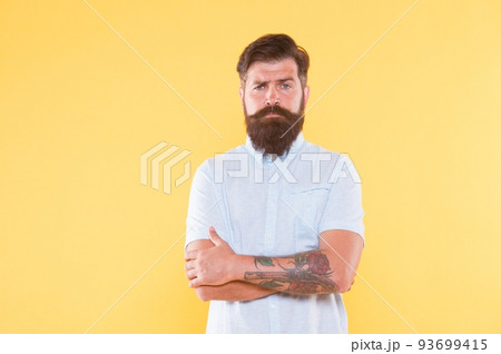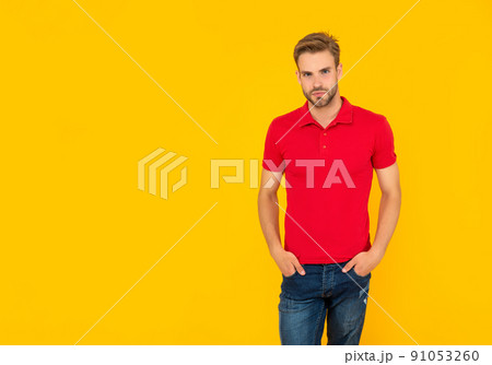 man with bristle in red shirt. young man with beard on yellow background with copy space.