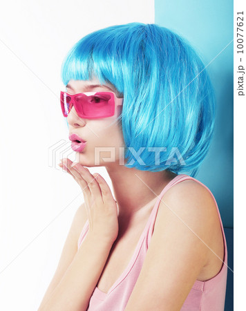 Manga Style. Profile of Charismatic Woman in Blue Wig Blowing a Kiss