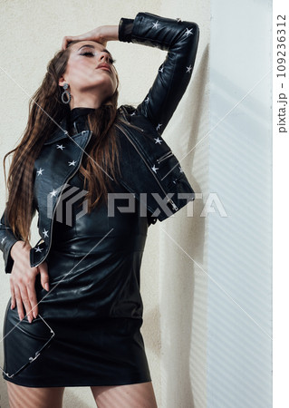 Portrait of a beautiful fashionable daring woman in dark clothes