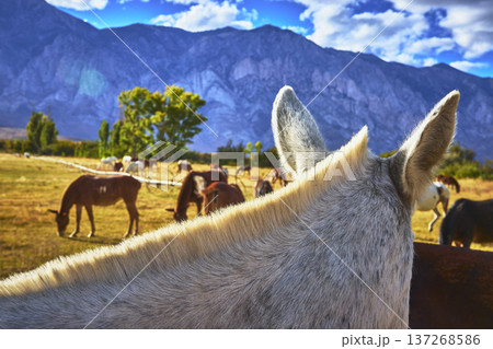 Horse Ears and Herd Grazing in Golden Field With Eastern Sierra Mountain Background