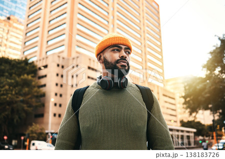 City, thinking or black man travel, walking and on morning trip, outdoor journey or commuting in Los Angeles. Urban buildings, explore town or African student, pedestrian or person in California, USA