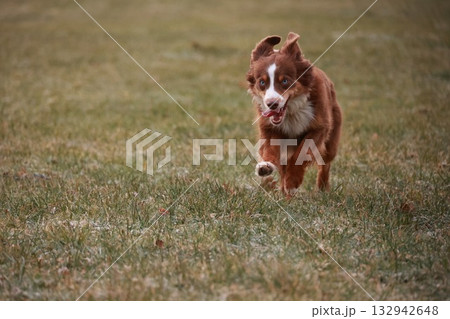 A brown and white dog is running through a field of grass