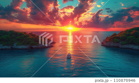 南洋の孤島とヨットと夕日:精緻CG