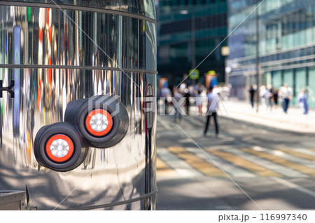 Woman wearing striped shirt and glasses riding public transport. Urban lifestyle, daily commute, and personal perspective in city environment.