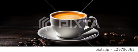 Coffee cup filled with rich espresso on a saucer surrounded by roasted coffee beans