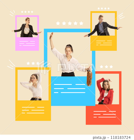 Contemporary art collage. Vibrant HR presentation with vibrant candidate profiles, showing right talents ready to join team.
