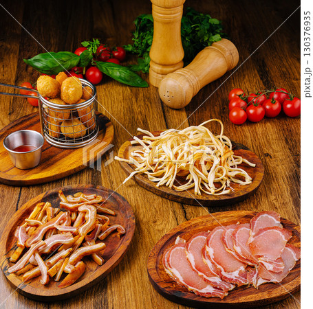Culinary delight featuring assorted meats and side dishes on wooden platters