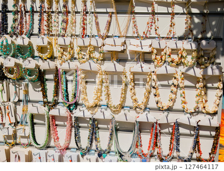 Colorful necklaces made of shells and gemstones on market display. Beach fashion, handmade souvenirs, and traditional crafts for tourists in coastal destinations.