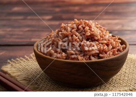 Cooked Thai Organic Red Jasmine Rice in wooden teak bowl.semi-milled rice.including fiber, B vitamins, and minerals such as iron and magnesium, offering a richer nutritional profile than traditional