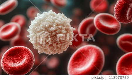 A white blood cell with a granular surface surrounded by many smooth red blood cells.