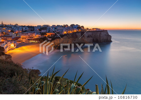Carvoeiro village while climbing of the sun, sunrise. Portugal.