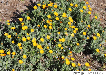 冬の庭に咲くヒメキンセンカ(冬知らず)のオレンジ色の小さい花