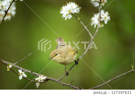 The common chiffchaff sitting on a tree branch with flowers