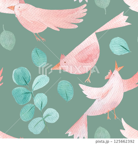 Pink birds flying, singing, with eucalyptus cartoon character, hand painted watercolor seamless pattern on green background. Clip art great for children design, wrapping paper, textile, stationary