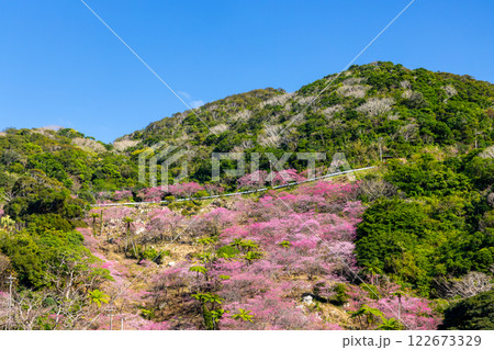 沖縄県国頭郡本部町 もとぶ八重岳桜まつり会場の琉球寒緋桜の桜並木とさくらの山