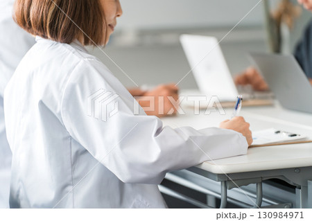 医療カンファレンス,勉強会,セミナー,研修を受ける白衣の医療スタッフ,医療従事者,医師