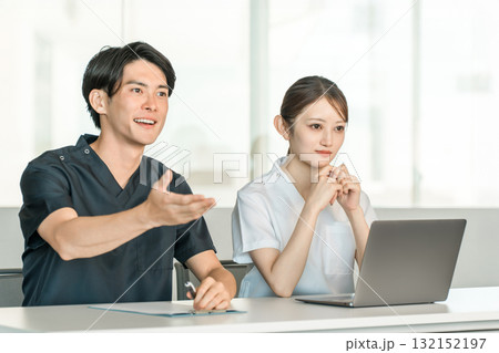 医療,カンファレンス・勉強会・セミナー・研修・研修を受けるスクラブ姿の男女医療スタッフ
