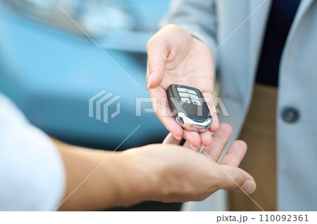 女性客に車の鍵を渡す若いセールスマン,営業マンの男性