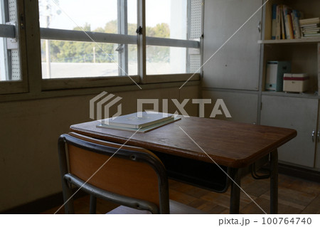 重ねて置かれた教室の机と椅子 暗めの無地背景