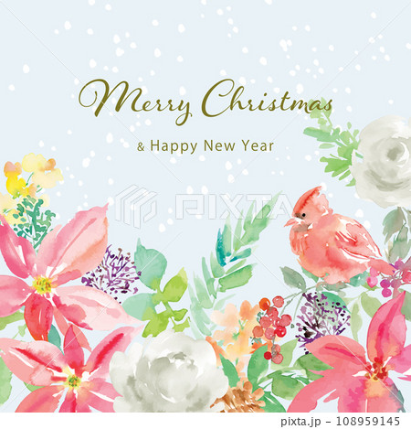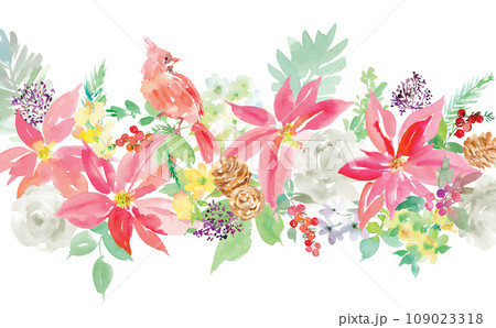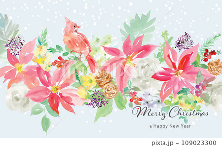水彩で描いたポインセチアとカーディナルのクリスマス用背景イラスト