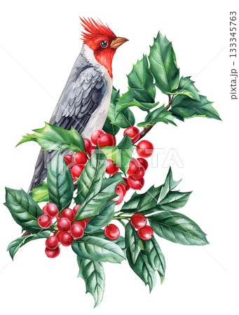 Watercolor Red Crested Bird with Holly Leaves and Berries. Winter holiday Botanical Illustration poster, forest design card