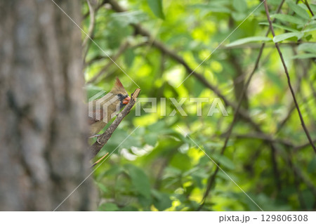 Female of northern cardinal bird (Cardinalis cardinalis) perched on a tree