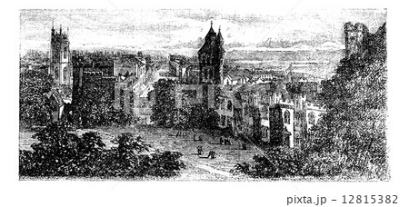 Cardiff view from castle, Wales, United Kingdom vintage engravin