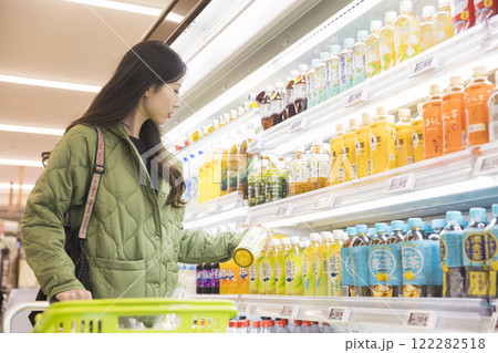 スーパーの冷凍食品売り場で買い物をする若い女性