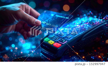 Close-up of a modern contactless payment terminal with a contactless credit card being used for contactless payment transaction on a sleek device