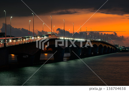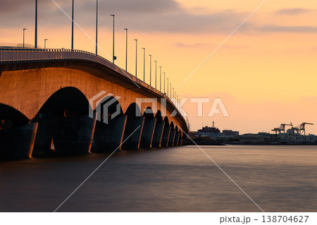 夕焼けに染まる空と海に架かる橋 カーミージー橋