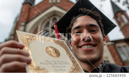 Young asian male celebrating graduation in front of historic university building. National Dissertation Day