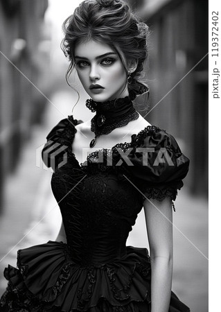 Elegant Lady in Black Corseted Gown in a Historic Urban Setting
