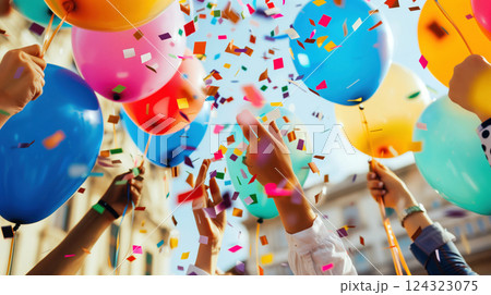 Close-up of hands spreading confetti up to sky. A festive graduation party setup with colorful balloons and sparkles.