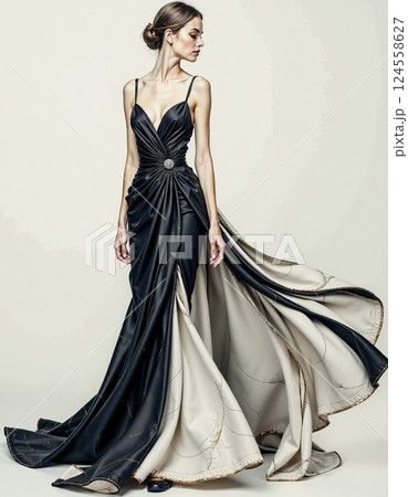 Elegant black evening gown with dramatic draping for formal events and fashion celebrations