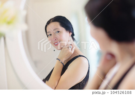 Asian young female wearing tiara crown princess white gown for party celebration or dinner