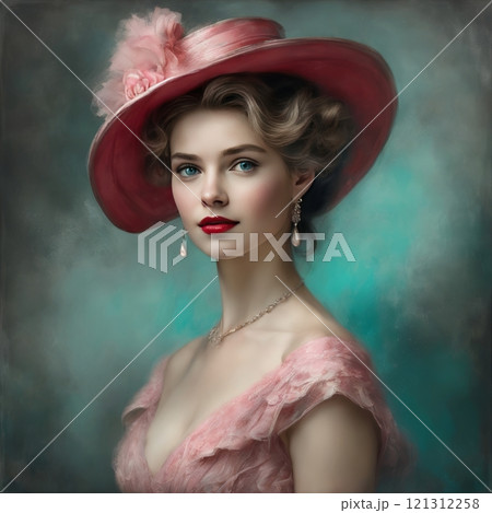 A captivating woman dressed in an elegant floral gown, wearing intricate gold jewelry. Her soft, serene gaze and flowing dark hair create a timeless, classic portrait.