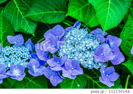 梅雨の晴れ間に咲く青いガクアジサイ