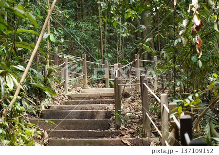 Lush Tropical Forest Path Steps and Green Foliage