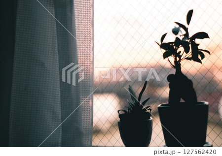 夕暮れ時の窓辺に置かれた二つの観葉植物シルエット