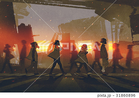 people with gas masks walking on street