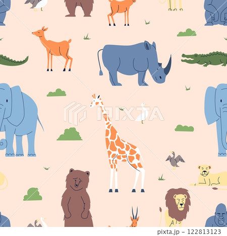Animal seamless pattern. Baby fabric print design with giraffe bear goose crocodile elephant monkey lion. African wild animals, vector background