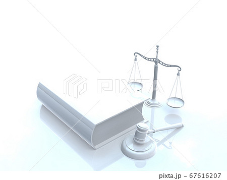 白い司法イメージ 小槌(ガベル) 天秤 六法全書 3DCGイラスト
