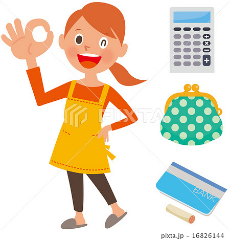 OKサインを出すエプロン女性と電卓,財布,通帳,はんこセット