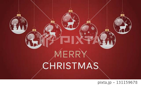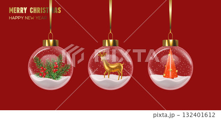 Merry Christmas and Happy New Year greeting card with glass baubles featuring reindeer, pine branches, berries, and red tree on red background. Elegant festive decoration. Vector illustration.