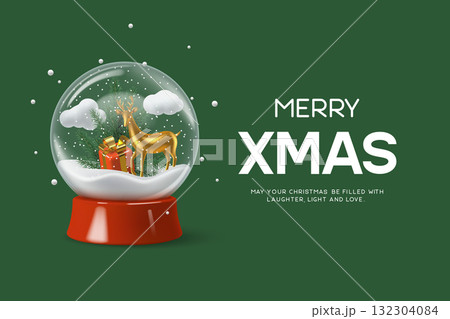 Merry Christmas greeting card with glass snowglobe, golden reindeer, gift box, pine branches, and snow on green background. Elegant festive winter design for holiday celebration. Vector illustration.