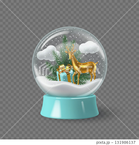 Glass snowglobe with golden reindeer, pine tree, blue gift box, and falling snow. Festive winter decoration for Christmas and New Year holiday design. Vector illustration.