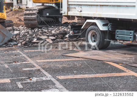解体工事現場 瓦礫を処理する重機と産業廃棄物収集運搬車