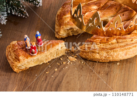 Epiphany cake on wooden table. Galette des rois traditional Epiphany cake in France
