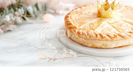 King cake or galette des rois in French. Traditional epiphany pie with golden paper crown and tiny charms