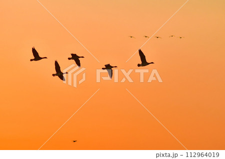 夕陽に赤く染まった空を飛ぶ北からの渡り鳥、ガンやハクチョウの群れ